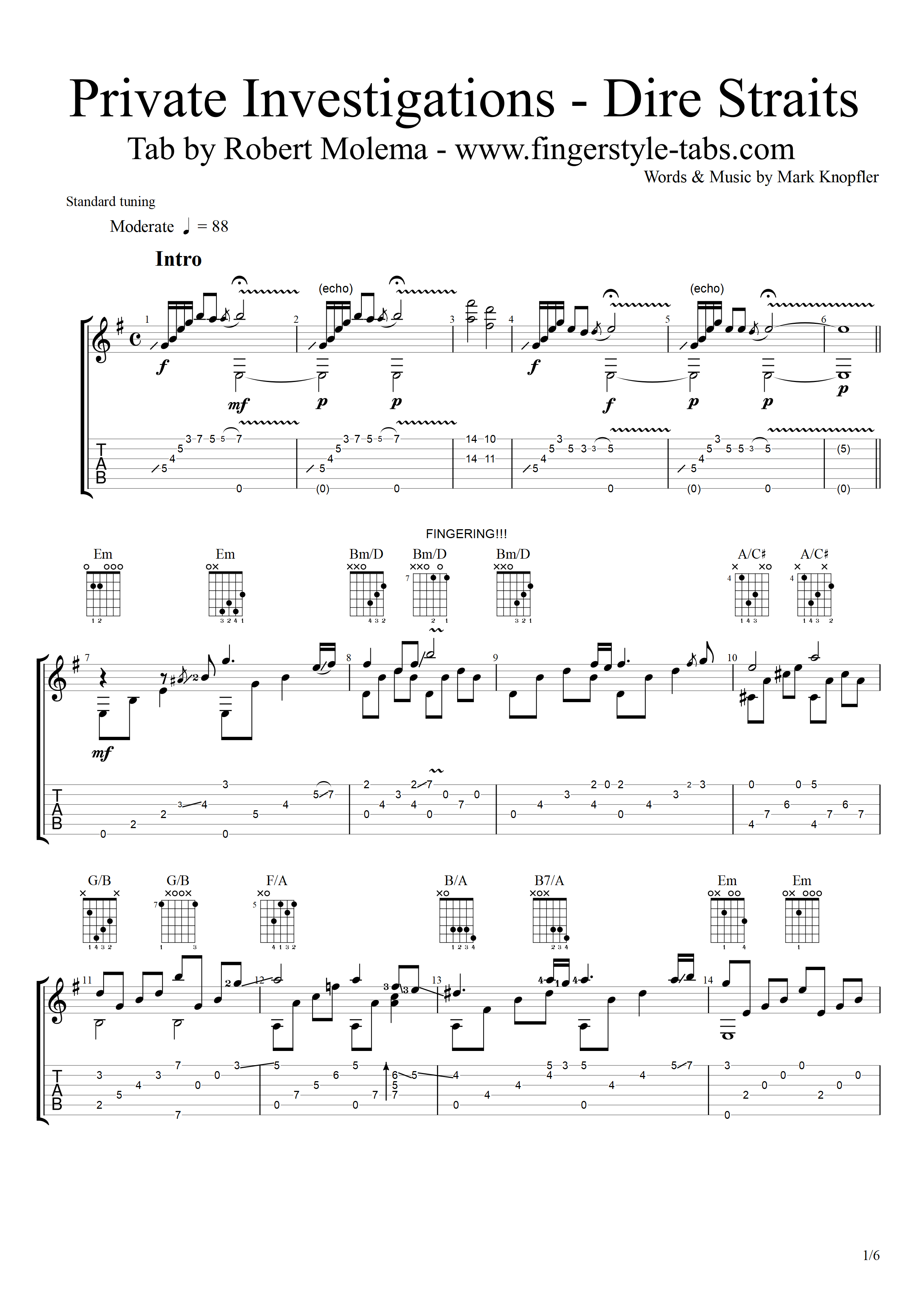 Songtitle: Private Investigations Category: Advanced Fingerstyle Description: A beautiful fingerstyle arrangement of this beautiful song by Mark Knopfler / Dire Straits. It's not easy, a lot of different fingerings to make it possible to play the piano part ánd the guitar part at once. I have arranged the piece as faithful to the original piano-part as played by Alan Clark combined with the beautiful classical sounding guitar-melody by Mark Knopfler. All at once in one fingerstyle tab. It took me quite a lot of time to find the posibilties to play it like this. I think I succeeded.